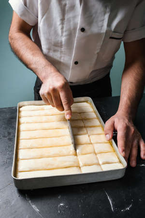 Food pastry. Baker works with dough. Chef cooks dessert at a restaurant