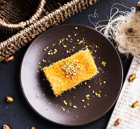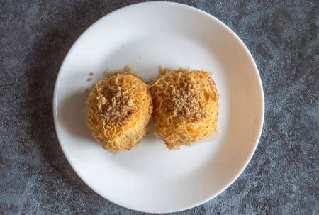 Traditional eastern dessert kunafa. Top view. Arabic cheese kunafa in white plate on dark wooden table with copy space. Konafa.