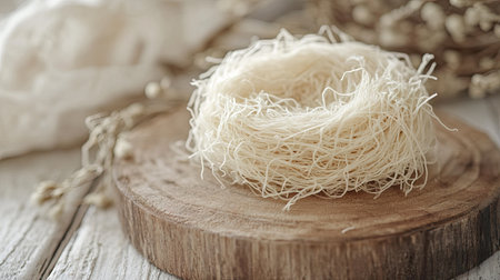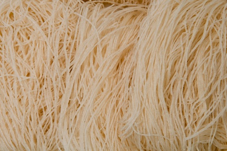 A close-up view of uncooked rice noodles with fine, delicate strands on a neutral background, highlighting their texture and potential for various culinary creations.