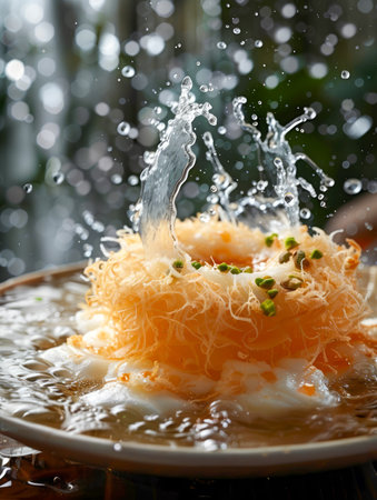 Freshly Cooked Crispy Noodles Topped with Spring Onions Splashed with Water Droplets on a Ceramic Plate AI Generative