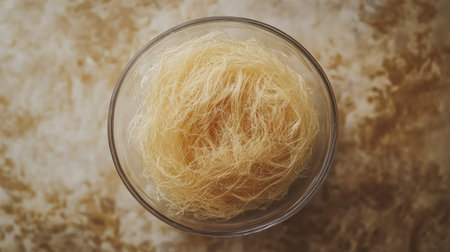 Top view of raw edible bird nest in a clear glass bowl, its fine fibers illuminated by soft natural light.