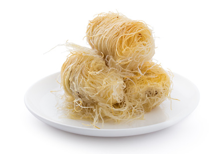 Turkish pastry cake kadaif pieces, traditional sweet, on white plate isolated on white background