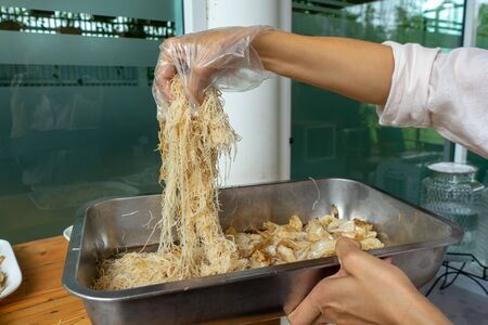 Kkultarae, honey and nut threads, traditional sweet, artisanal making