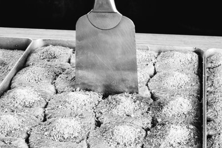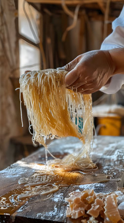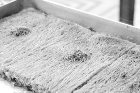 Kadaif strands prepared for traditional dessert in a vibrant kitchen setting during a sunny afternoon