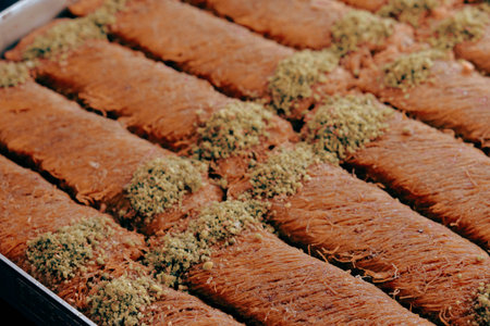 Traditional arabic and turkish sweets pastry dessert kadaif (kunafa, baklava), with peanuts, sold at local market