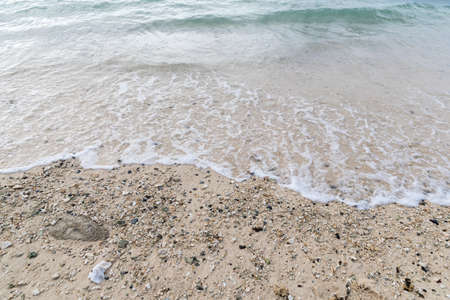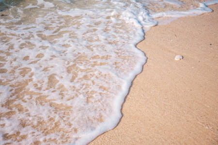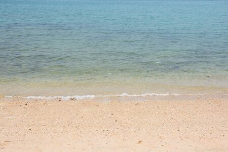 Beautiful clear sand beach and tropical light blue sea. Soft wave of blue ocean on sandy beach. Sallow water, Clear water. Seaside.