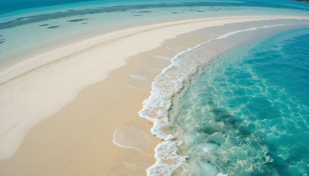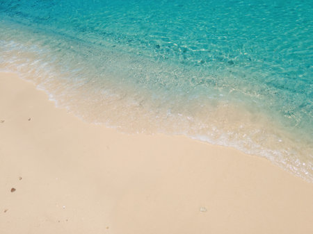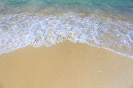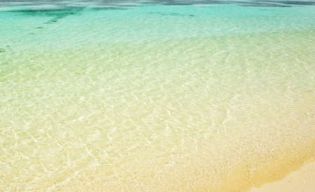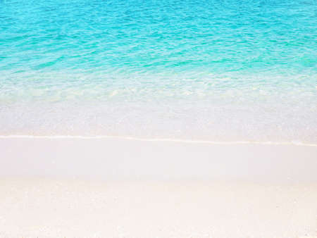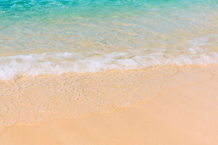 Beach background. Tropical paradise. Sandy shore washing by the wave. Crystal clear turquoise sea water. Dreams summer vacations destination.