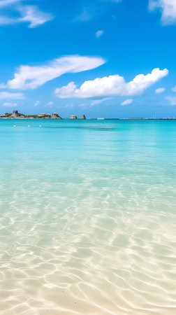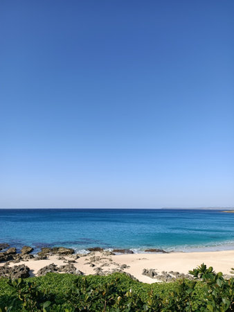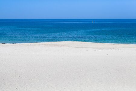 Clear blue sea and sandy beach on a bright and sunny day. Beautiful nature scenery for a holiday trip.