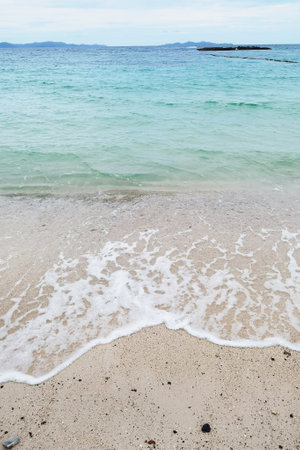 Peaceful clean sandy beach on tropical island in south of Thailand, summer outdoor day light, relaxing by the sea