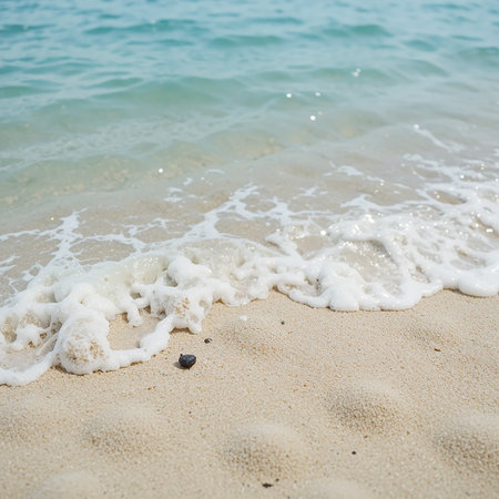 A serene beach scene featuring gentle waves lapping against the shore, leaving a trail of white foam on the sand. The water is a beautiful turquoise, and the sand is light beige with small footprints and a small pebble visible.