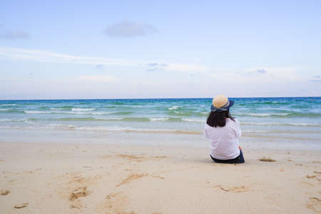 A young pretty girl lies on the white sand by the ocean with bruise water. A paradise for travel on vacation. Looks towards the sea, enjoyment in a beautiful place. copy place.