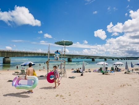 OKINAWA, JAPAN - AUG 30, 2019 : People on the Beach Activity. Kouri beach Summer vacation High season Okinawa japan