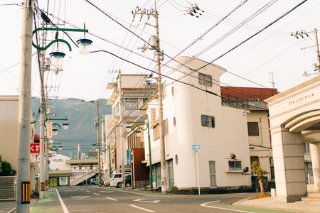 Beppu, Japan - September 28, 2014: Street near Beppu station in the morning. Beppu is a city located in Oita Prefecture on the island of Kyushu, Japan, at the west end of Beppu Bay. In November 2013 the city had a population of 122,085 and a population de