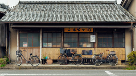 This image showcases a charming traditional shopfront in Japan, with vintage bicycles lined up outside, reflecting rural simplicity and cultural heritage.