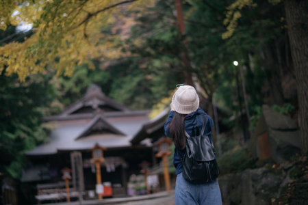 Asian woman discovers spiritual essence of Japanese shrines and temples, radiating happiness, faith, and cultural appreciation in Tokyo and Kyoto.