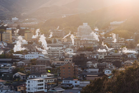 Beppu, Japan, city panorama skyline, Kannawa onsen distict, Oita prefecture, Kyushu island region,, Yukemuri observation deck, rising hot steam from onsen ryokan bath houses, Beppu resort hot springs