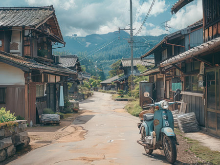 Rural Japanese village scenery with blue motorcycle parked near traditional houses, plants and clear blue sky with fluffy clouds. Perfect for travel agency and tourism.