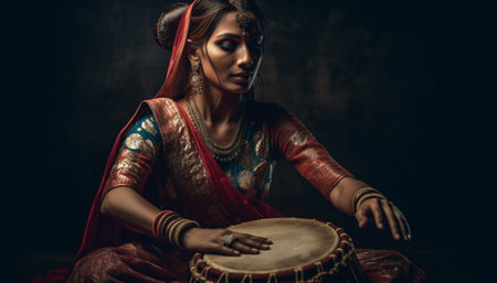 Elegant Woman in Traditional Attire with Dramatic Lighting and Jewelry.