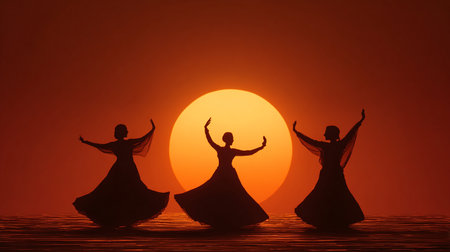 Dancers twirling gracefully in colorful attire. Dynamic performance enhanced by captivating lighting effects. Concept of dance performances, cultural expression, theater events.