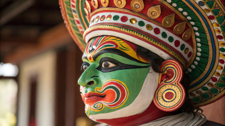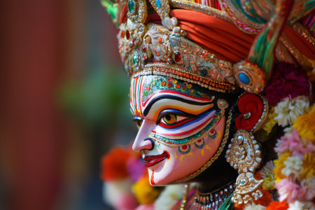 Close up of a chhau dancer wearing vibrant makeup and traditional costume, celebrating the Navratri festival with artistic expression