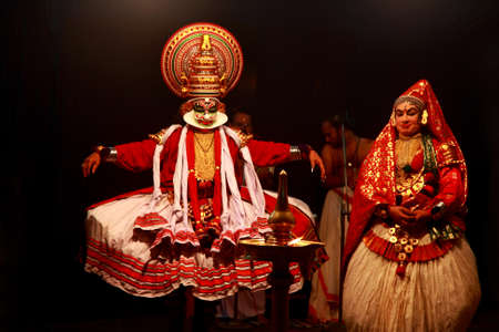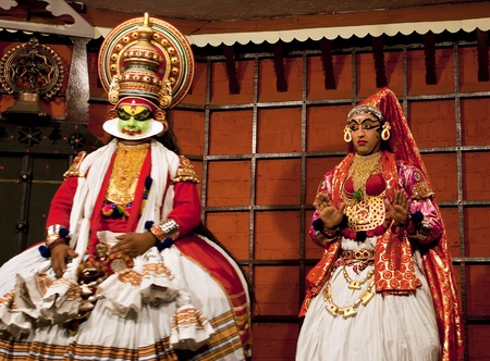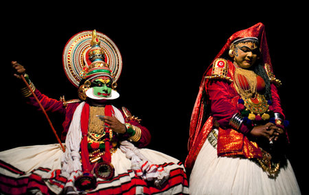 Kochi, India - March 15, 2014: An Indian classical dance form named Kathakali artists tells Indian mythological stories through numerous gestures techniques and emotions in front of several European tourists.