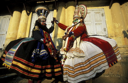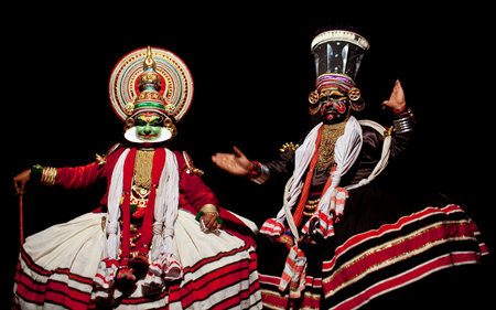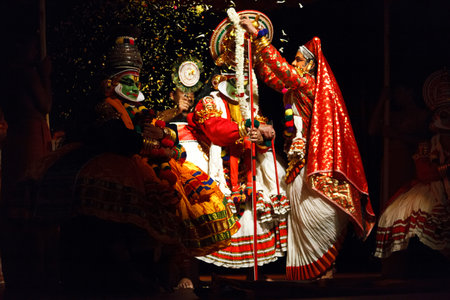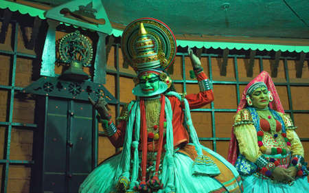 VARKALA, INDIA - FEBRUARY 10, 2010: Kathakali actors performing on the evening show in Varkala, Kerala, South India. Kathakali is the ancient classical dance form of Kerala.