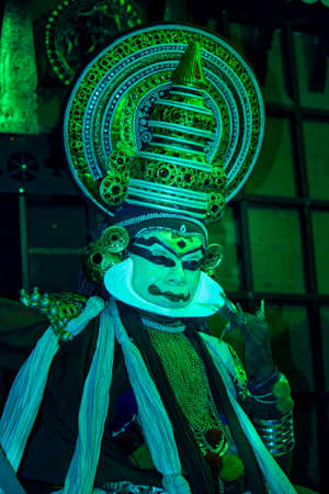 VARKALA, INDIA - FEBRUARY 3, 2010: Kathakali actor performing on the evening show in Varkala, Kerala, South India. Kathakali is the ancient classical dance form of Kerala.