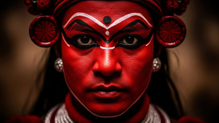 Indian performer with red face paint, intense gaze, traditional costume