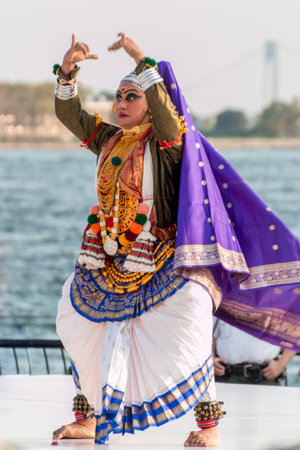 New York - Aug 20: A woman with costume and make-up performs a traditional indian dance at a cultural show on August 20, 2014 at Battery Park, New York, USA.