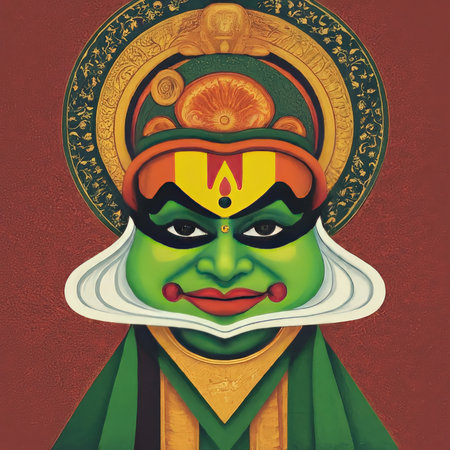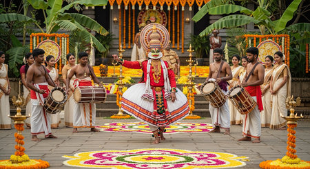 Traditional Kathakali dancer in full makeup and costume performing during Onam festivities. Generative AI