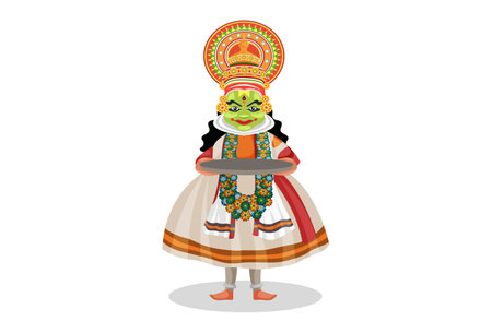 Vector graphic illustration. Kathakali dancer is holding a plate in hands. Individually on a white background.