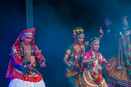 Munnar, India - March 10, 2023: Four performers in elaborate traditional costumes, including a Kathakali dancer with face paint and headdress and three classical Indian dancers with jewelry and flower garlands, are seen on stage under blue lighting during
