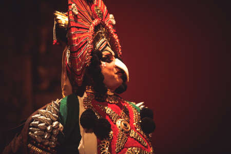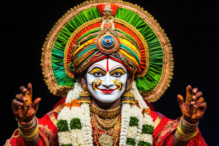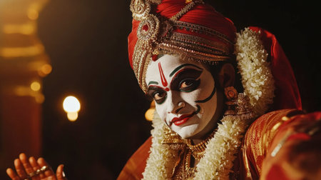 Detailed Dussehra Dance Performance with Traditional Costume and Intricate Face Paint for Cultural Celebration Design.