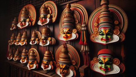 Traditional elaborate Kathakali dance masks displayed on a wooden rack, Ai generated image