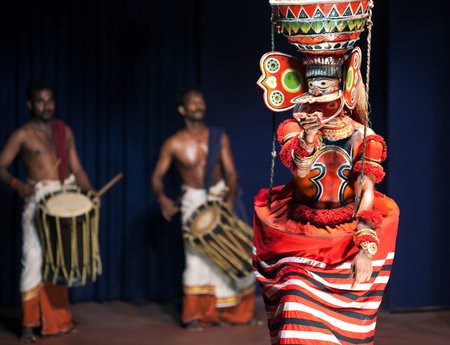 FORT COCHIN, INDIA - FEBRUARY 17, 2010: Actor performing traditional Indian dance Theyyam in in Fort Cochin, South India. Kathakali - the classical dance-drama of Kerala based on Indian mythology, and noted for its elaborate costumes and gestures.