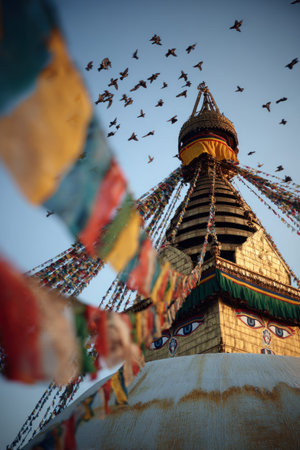 A tall, layered structure is adorned with colorful prayer flags in the foreground and a flock of birds in the sky. The composition emphasizes the contrast between the detailed architecture and the open sky. The image uses a warm color palette with natural lighting. This image could be suitable for editorial or travel-related content.