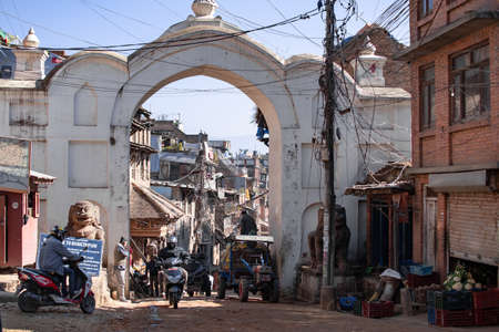 Bhaktapur, Kathmandu, Nepal - December 23, 2019: Unidentified people on motorbikes and a tractor drives in and out a white arched entrance on December 23, 2019 in Bhaktapur, Kathmandu, Nepal