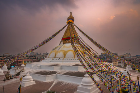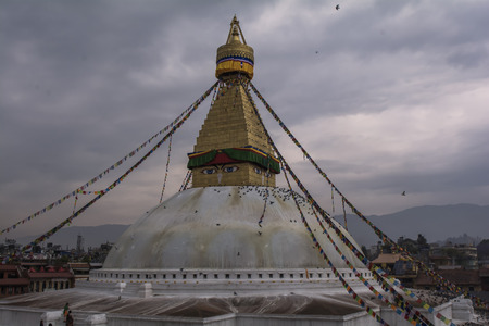 Boudhanath is one of the most holy places and largest Buddhist stupa in Nepal, with colorful prayer flags fluttering against the overcast sky.
