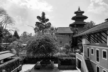 Bhaktapur, Kathmandu, Nepal - December 23, 2019: Cityscape view from a roof top over brick houses and temples with unidentified people, their gardens, plants and laundry on the roofs on December 23, 2019 in Bhaktapur, Kathmandu, Nepal