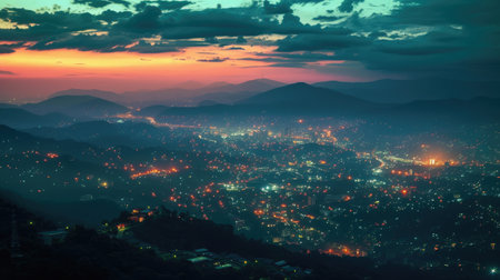 Aerial view of a bustling cityscape at twilight, glowing lights, traffic snaking through streets, hint of a blue sky fading to black