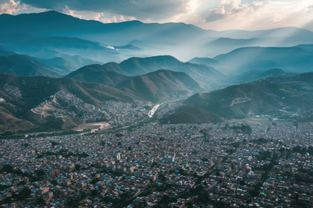 This photo shows a birds-eye view of a city with towering mountains providing a stunning backdrop, Bird's eye view of a city fenced by mountains, AI Generated