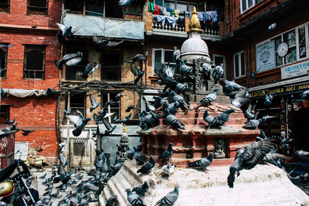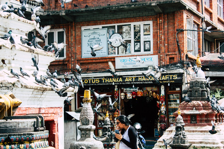 Kathmandu Nepal August 24, 2018 View of pigeons flying around the Shree Gha Stupa Temple located in Naghal district between Thamel and Durbar square in Kathmandu in the morning