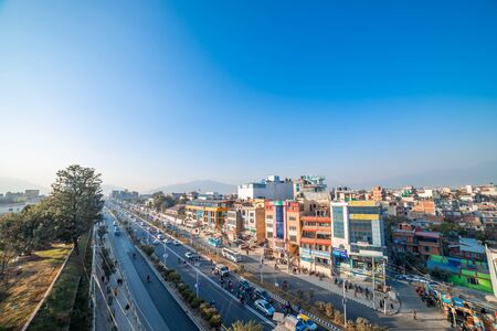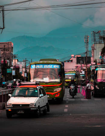Kathmandu, Nepal - December 29 2019: Vehicles making their way through the main street of the city