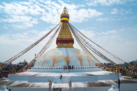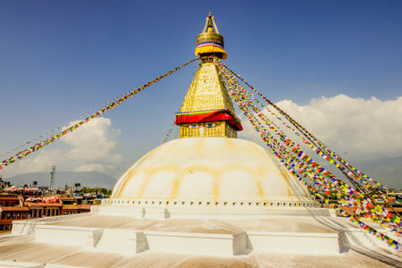 Kathmandu, - Nepal, October 25, 2019: Multicolored praying flags hinged on the top of Boudhanath Stupa-the largest spherical stupas in Nepal and very sacred place for Buddhists in Kathmandu, Nepal.