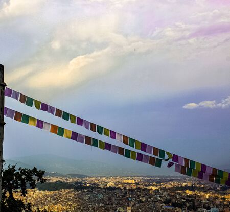 View of Kathmandu from the Swayambhunath temple complex in the foreground colorful prayer flags