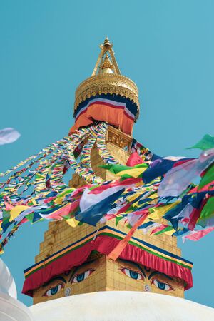 Buddha eyes close up with prayer flags at Bodhnath stupa in Kathmandu valley, Nepal