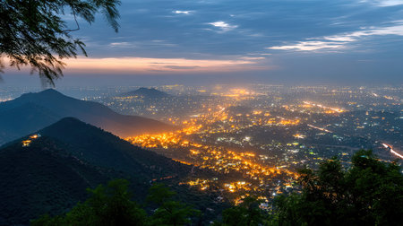 Capture the mesmerizing beauty of a city illuminated at dusk, surrounded by mountains and a serene atmosphere, perfect for cityscape lovers.