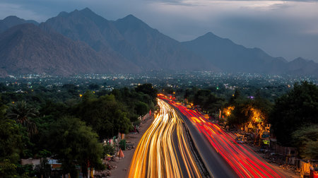 Aerial view of a highway at twilight. The highway passes through a valley with trees and a city nestled amongst the mountains. Light trails from moving vehicles are visible on the highway.