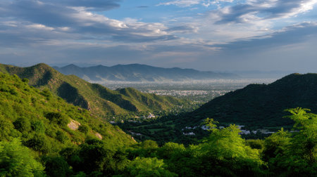 This captivating landscape features a stunning view of mountains and a lush valley under a clear sky. Perfect for travel enthusiasts and nature lovers.