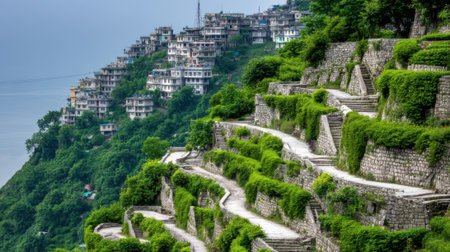 A scenic view of winding stone pathways through lush terraced gardens on a steep mountainside, with a densely populated hill station in the background under a cloudy sky.